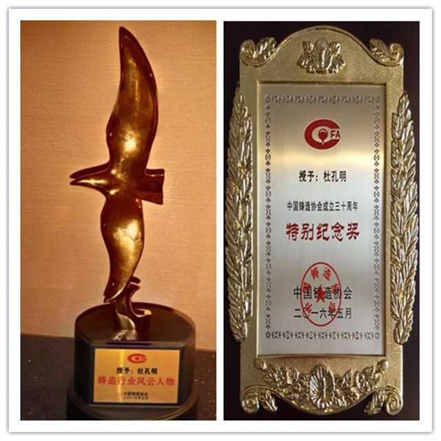同時,在第二屆中國鑄造節(jié)行業(yè)表彰會中,杜孔明總經(jīng)理榮獲“鑄造行業(yè)風(fēng)云人物”、“中國鑄造協(xié)會成立三十周年特別紀(jì)念獎”和“奉獻(xiàn)鑄造行業(yè)三十年工作者”三項(xiàng)榮譽(yù)稱號。