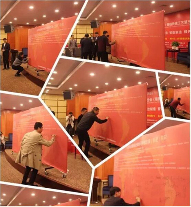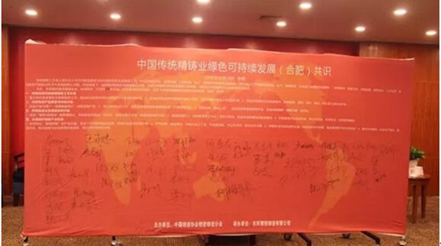 在東風(fēng)精鑄、精鑄分會(huì)組織倡議下,10月28日,傳統(tǒng)精鑄第五屆高層論壇順利舉行,來自國(guó)內(nèi)重點(diǎn)精鑄企業(yè)、科研院所、社團(tuán)等 95名代表,在安徽合肥共同見識(shí)了《中國(guó)傳統(tǒng)精鑄業(yè)綠色可持續(xù)發(fā)展合肥共識(shí)》簽字儀式,其中60余名代表在幕板上簽字表達(dá)了綠色可持續(xù)發(fā)展的決心。