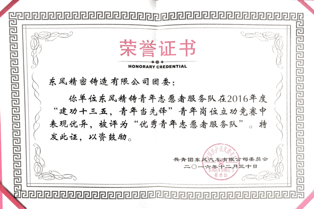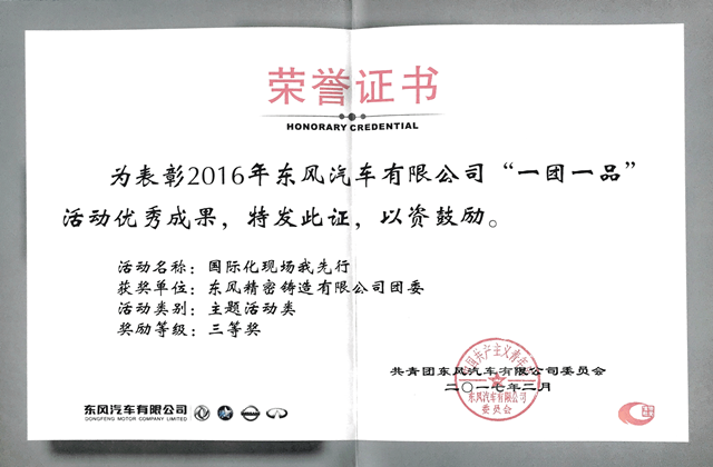 2016年度,東風(fēng)精鑄團(tuán)委積極開展“一團(tuán)一品”創(chuàng)建活動,經(jīng)年初立項(xiàng)、過程實(shí)施、成果總結(jié)、申報(bào)及上級單位評定等環(huán)節(jié),東風(fēng)精鑄團(tuán)委“國際化現(xiàn)場我先行”主題活動榮獲東風(fēng)汽車有限公司“一團(tuán)一品”三等獎。并且在2016年度“建功十三五,青年當(dāng)先鋒”青年崗位立功競賽活動中,東風(fēng)精鑄團(tuán)委帶領(lǐng)團(tuán)員青年立足崗位、積極作為、勇于擔(dān)當(dāng),被評為“東風(fēng)汽車有限公司優(yōu)秀青年志愿者服務(wù)隊(duì)”及 “東風(fēng)汽車公司優(yōu)秀青年志愿者服務(wù)隊(duì)”。